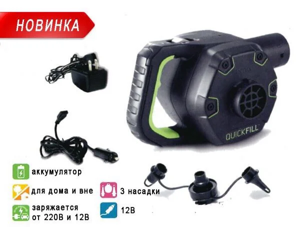 Очень востребован среди рыбаков для накачивания лодок, но насос не является компрессором и сможет наполнить баллоны лодки на 80% от необходимого максимума, а оставшиеся 20% необходимо будет докачать ножным насосом который обычно идет в комплекте с лодкой.